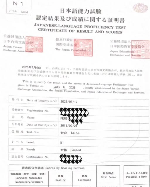 🎉 捷報,再添亮眼佳績! 恭喜 G8 彭同學成功取得日文檢定最高等級 N1!