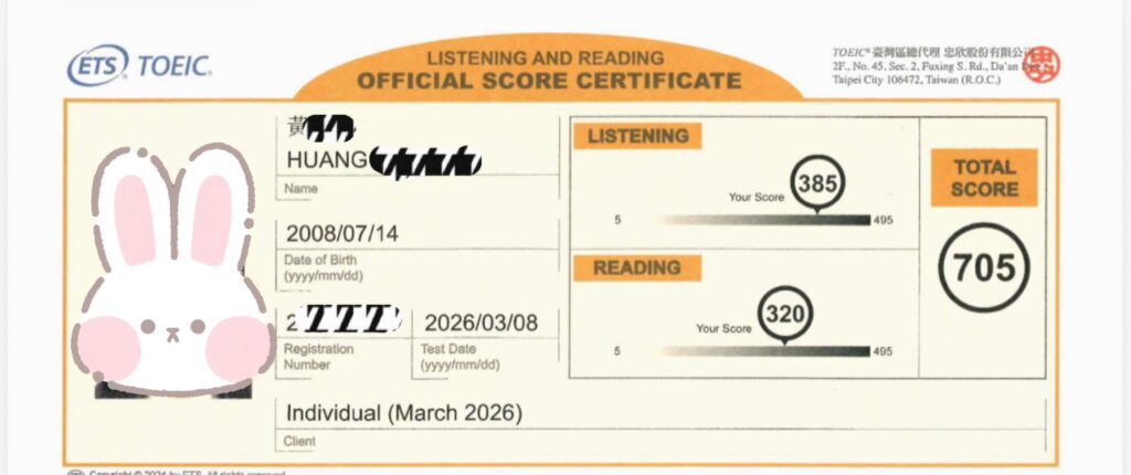 捷報傳來,滿滿感動與欣喜— 本機構高中部參與本次 多益測驗,600分以上達成率突破六成,展現孩子們在穩定學習與長期累積下的豐碩成果。同時,也恭喜高中部 G12 黃同學榮獲705分的優異成績,為努力寫下亮眼的一頁。